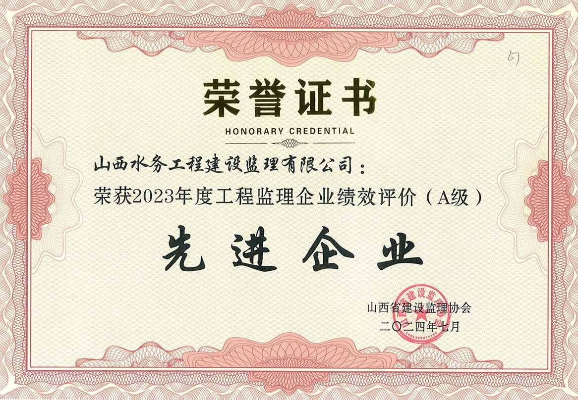近日,山西水務工程建設監理有限公司榮獲山西省建設監理協會“2023年度工程監理企業績效評價(A級)先進企業”稱號,同時,公司兩名同志被評為“2023年度績效評價優秀總監理工程師”。