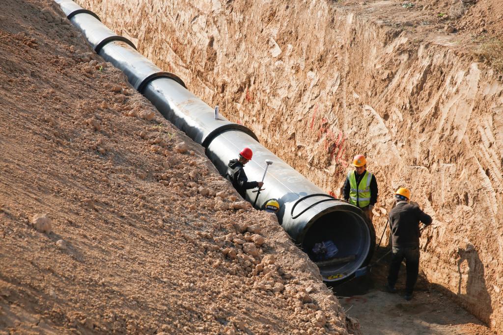 ▲施工15標全程55.621公里,目前已開挖30公里,管線鋪設(shè)23公里。圖為東一干邊坡開挖管道安裝