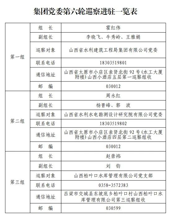 根據集團黨委巡察工作統一部署,3月3日至4日,集團第六輪巡察完成進駐,三個巡察組將以“一對一”形式對水工局集團、設計院公司、柏葉口水庫黨組織開展常規巡察;期間同步開展意識形態工作責任制落實情況和選人用人情況專項檢查。